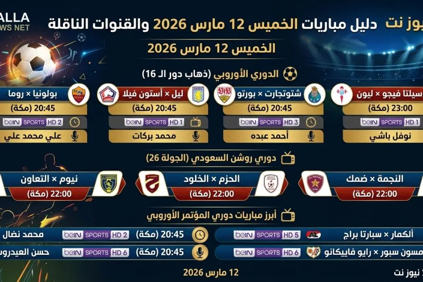دليل مباريات اليوم الخميس 12 مارس 2026 في الدوري الأوروبي ودوري روشن السعودي. تعرف على المواعيد والقنوات الناقلة والمعلقين الآن.