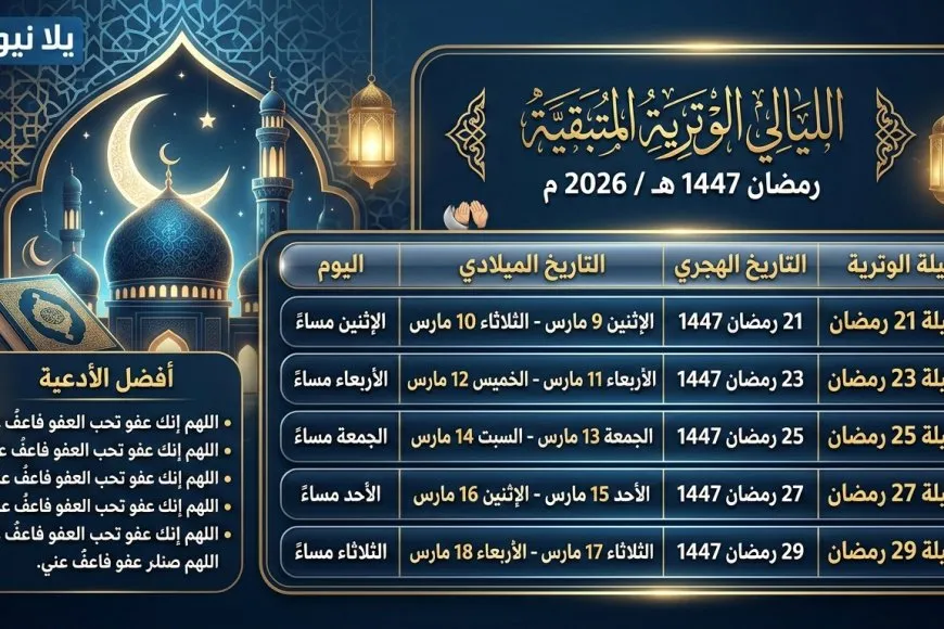 جدول الليالي الوترية المتبقية في رمضان 2026