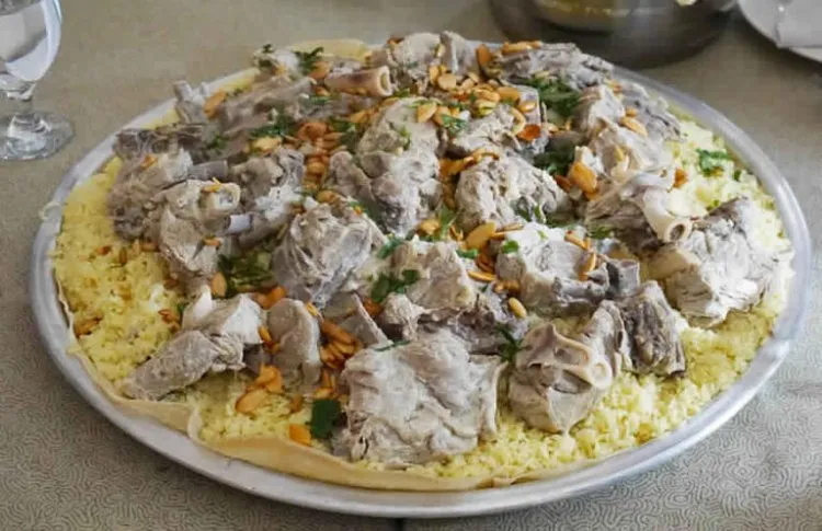 4.بعد نضوج اللحم يضاف إليه اللبن الجميد ويغلى مع اللحم لمدة 8 دقائق تقريباً، ثم يرفع اللحم من المرق. 5.في طبق التقديم يفرد خبز الشراك، يوزع فوقه الأرز، وبعده اللحم ويزين بالمكسرات والبقدونس. 6.يسكب المرق في كاسات ويقدم إلى جانب المنسف.