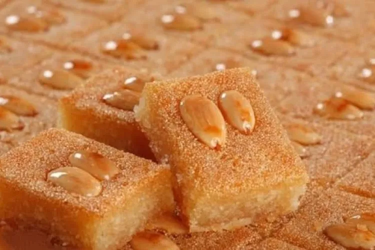 نقطِّع النمورة إلى مربعاتٍ ونضع في كل مربع نصف حبةٍ من اللوز، ثم ندخل قالب الخبز إلى الفرن في المنتصف.