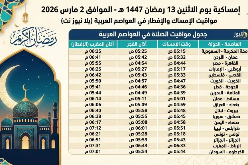 تزامناً مع الثلث الثاني من شهر رمضان المبارك (أيام المغفرة) لعام 1447 هـ، يسرنا تقديم الدليل الشامل لمواقيت الصلاة في العواصم العربية. إليكم المواعيد الدقيقة ليوم الاثنين 13 رمضان، الموافق 2 مارس 2026، حسب التوقيت المحلي لكل مدينة.